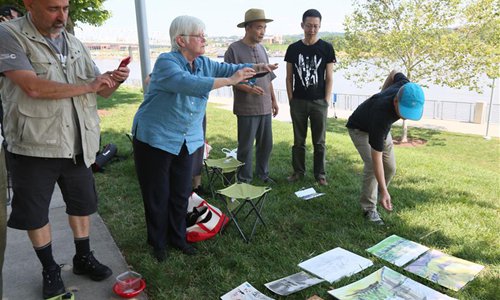 Jan Brown Checco (2nd L), lead artist of the Cincinnati/Liuzhou Paint Out Program, takes pictures of the drawings with her cell phone, at the Smale Riverfront Park in Cincinnati of Ohio, the United States, July 25, 2019. Chinese and U.S. artists recently took part in the Cincinnati/Liuzhou Paint Out Program, in which artists from south China's Guangxi Zhuang Autonomous Region were invited to visit Cincinnati for a week. They visited museums and galleries, exchanged art views and techniques with their U.S. counterparts, and presented a joint exhibition. Cincinnati and Liuzhou celebrated their 30th anniversary of the establishment of sister city relations last year. (Xinhua/Zhang Fengguo)