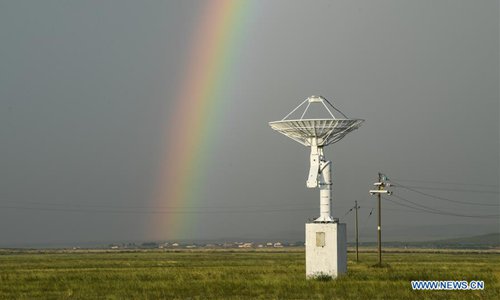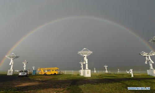 Photo taken on July 27, 2019 shows a rainbow over the Ming'antu observing station of the National Astronomical Observatories of the Chinese Academy of Sciences, in Zhengxiangbai Qi, north China's Inner Mongolia Autonomous Region. (Xinhua/Liu Lei)