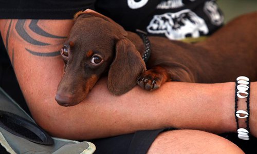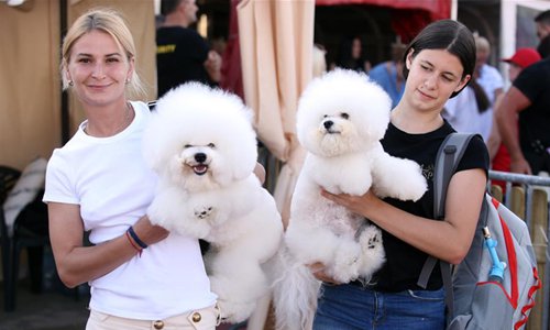 People carry their dogs at the Four Summer Night Dog Shows in Split, Croatia, July 25, 2019. (Xinhua/Miranda Cikotic)