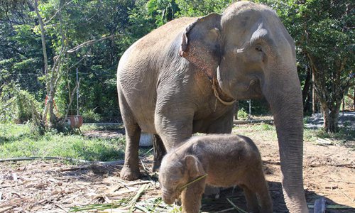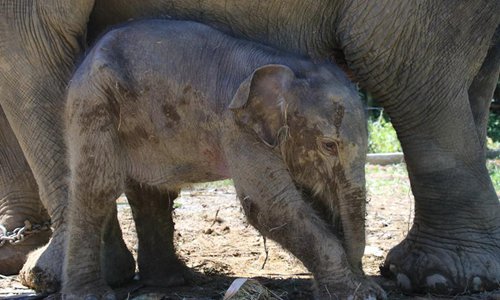 A four-day female baby Sumatran elephant is seen with her mother at Conservation Rescue Unit Alue Kuyun, West Aceh, Indonesia, July 27, 2019. (Photo by Yulham/Xinhua)