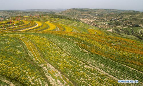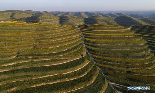Tourists visit the terraced field in Pengyang County of Guyuan, northwest China's Ningxia Hui Autonomous Region. (Xinhua/Yang Zhisen)