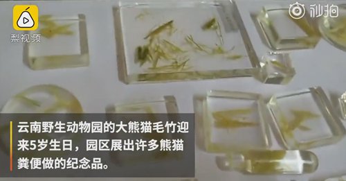 To celebrate the 5th birthday of captive panda Mao Zhu, the Yunnan Wild Animal Park in Kunming, Yunnan Province exhibited paper-based and amber gifts created from the bear's bamboo-based excrement, according to a video posted Friday on Sina Weibo by Pear Video.