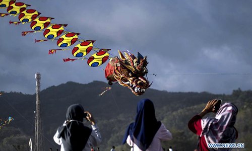 People take photos of a dragon kite during the 7th annual Jogja International Kite Festival 2019 held at Parangkusumo beach in Yogyakarta, Indonesia, July 28, 2019. (Photo by Supriyanto/Xihua)