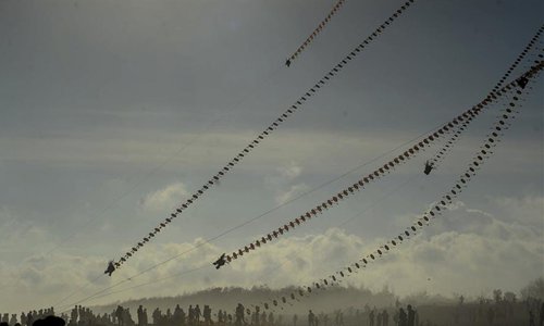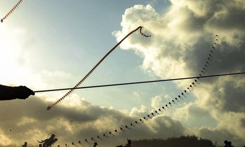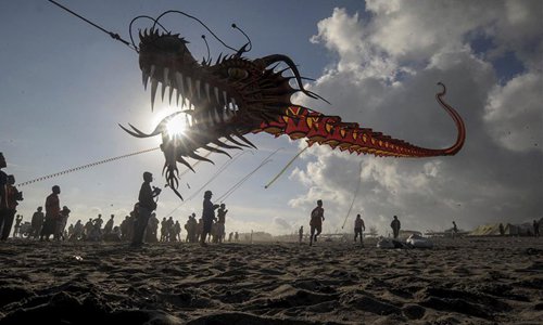 Participants fly their dragon kites during the 7th annual Jogja International Kite Festival 2019 held at Parangkusumo beach in Yogyakarta, Indonesia, July 28, 2019. (Photo by Supriyanto/Xihua)
