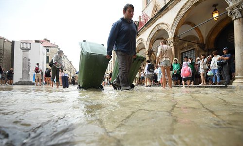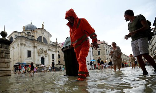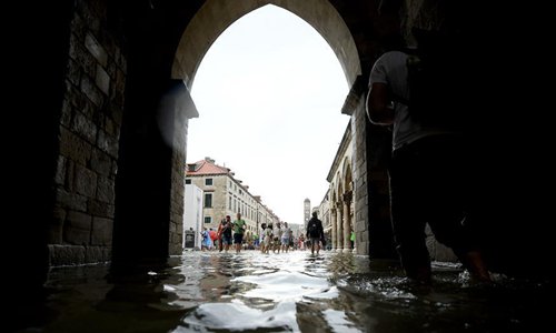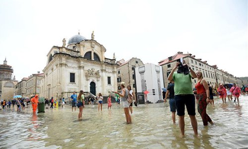 People walk on a flooded street of the Old Town of Dubrovnik, Croatia, on July 28, 2019. The famous tourist destination was hit by heavy rain and thunderstorm on Sunday. (Marko Lukunic/Pixsell via Xinhua)