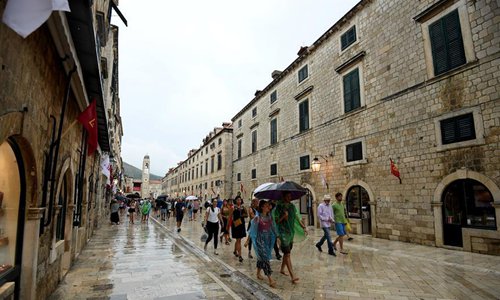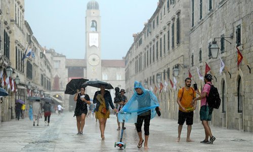 Tourists pose in the rain on a street of the Old Town of Dubrovnik, Croatia, on July 28, 2019. The famous tourist destination was hit by heavy rain and thunderstorm on Sunday. (Marko Lukunic/Pixsell via Xinhua)