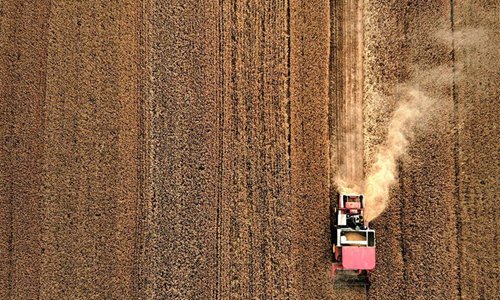Aerial photo taken on May 29, 2019 shows a harvester working at a wheat field in Daluli Village of Wuyang County, central China's Henan Province. (Xinhua/Li An)
