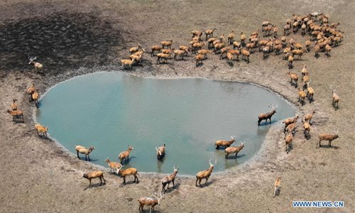 Aerial photo taken on June 28, 2019 shows milu deers, also known as Pere David's deers, gathering around a pond in Dafeng Milu National Nature Reserve in east China's Jiangsu Province. (Xinhua/Li Xiang)
