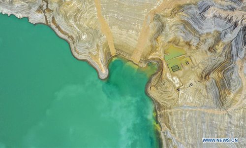 Aerial photo taken on June 23, 2019 shows a part of Xiabandi reservoir on the Pamir Plateau in northwest China's Xinjiang Uygur Autonomous Region. (Xinhua/Hu Huhu)