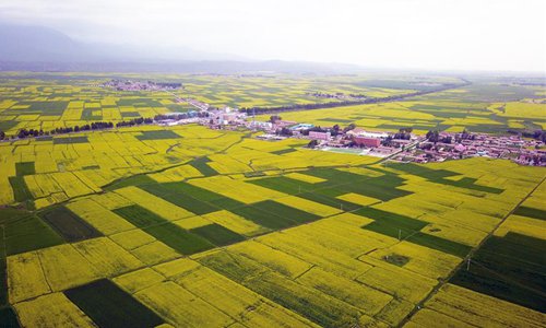 Aerial photo taken on July 17, 2019 shows cole flowers in Minle County of Zhangye City, northwest China's Gansu Province. (Xinhua/Fan Peishen)