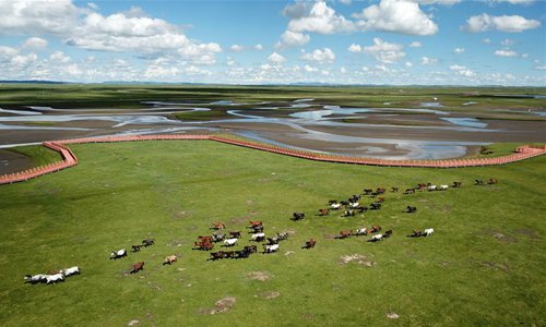 Aerial photo taken on June 22, 2019 shows horses running at the Hequ horse ranch in Maqu County of Gannan Tibetan Autonomous Prefecture, northwest China's Gansu Province. (Xinhua/Ma Ning)