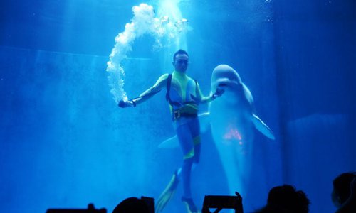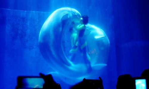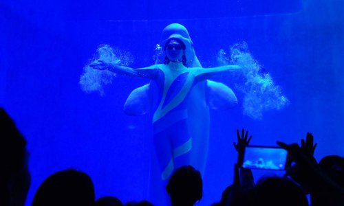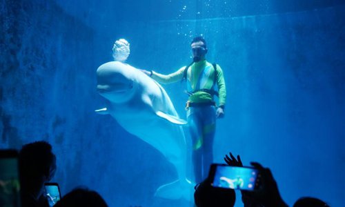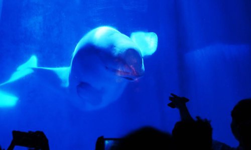 Tourists view the white whale performance at the Harbin Polarland in Harbin, capital of northeast China's Heilongjiang Province, July 27, 2019. Harbin Polarland had become a hot spot for children in the summer vacation. (Xinhua/Wang Jianwei)