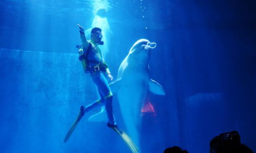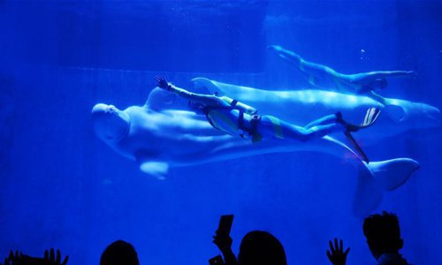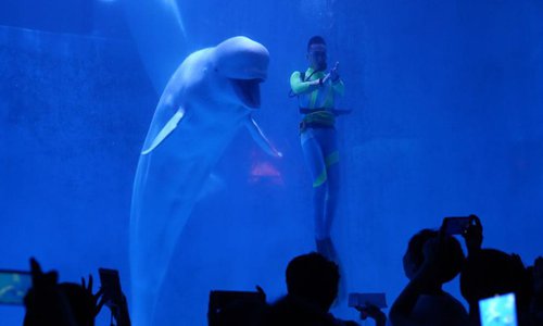 The white whale performance is seen at the Harbin Polarland in Harbin, capital of northeast China's Heilongjiang Province, July 27, 2019. Harbin Polarland had become a hot spot for children in the summer vacation. (Xinhua/Wang Jianwei)