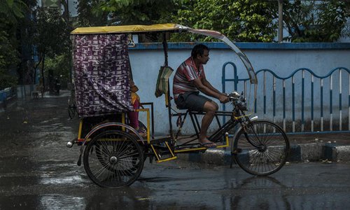 A rickshaw puller carries passenger in heavy rain in Kolkata, India, on July 28, 2019. India is currently having its monsoon season that will last till September. (Xinhua/Tumpa Mondal)