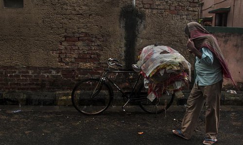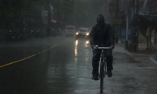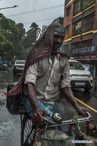 A cyclist rides in heavy rain in Kolkata, India, on July 28, 2019. India is currently having its monsoon season that will last till September. (Xinhua/Tumpa Mondal)