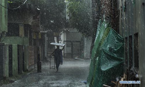 A woman walks in heavy rain in Kolkata, India, on July 28, 2019. India is currently having its monsoon season that will last till September. (Xinhua/Tumpa Mondal)