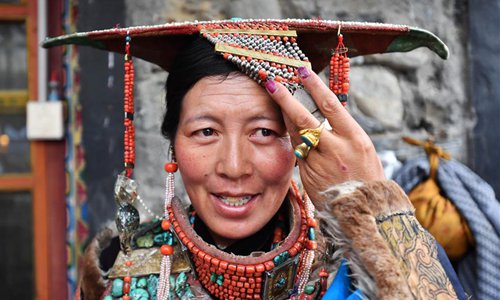 A woman wears Burang clothes in Burang County of Ali, southwest China's Tibet Autonomous Region, July 22, 2019. Burang clothes, traditional wearing in Burang County of Ali, has a history of more than 1,000 years. One suit may weigh about 25 kilograms because it is decorated with gold, silver, pearls and other jewels. (Xinhua/Chogo)