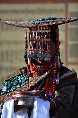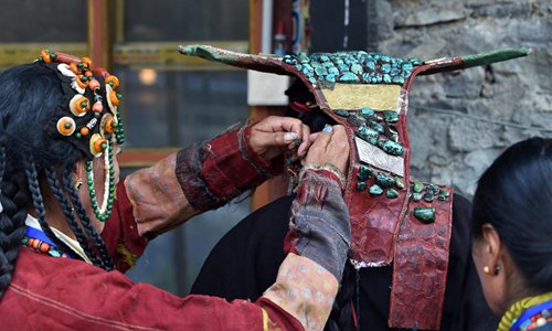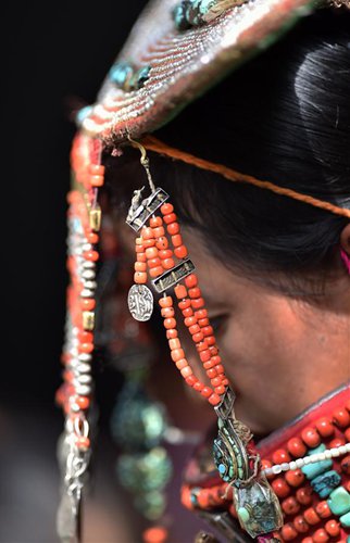 A woman puts on Burang clothes in Burang County of Ali, southwest China's Tibet Autonomous Region, July 22, 2019. Burang clothes, traditional wearing in Burang County of Ali, has a history of more than 1,000 years. One suit may weigh about 25 kilograms because it is decorated with gold, silver, pearls and other jewels. (Xinhua/Chogo)