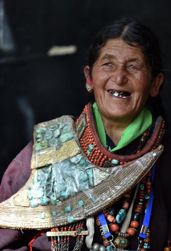 An elder woman wears Burang clothes in Burang County of Ali, southwest China's Tibet Autonomous Region, July 22, 2019. Burang clothes, traditional wearing in Burang County of Ali, has a history of more than 1,000 years. One suit may weigh about 25 kilograms because it is decorated with gold, silver, pearls and other jewels. (Xinhua/Chogo)