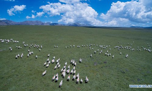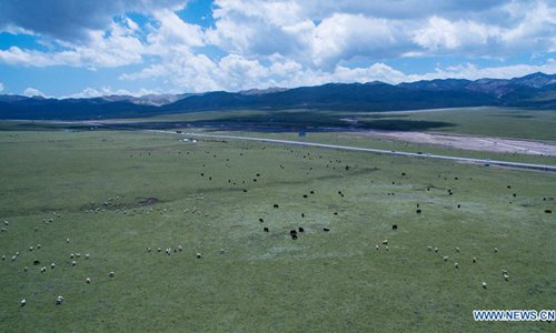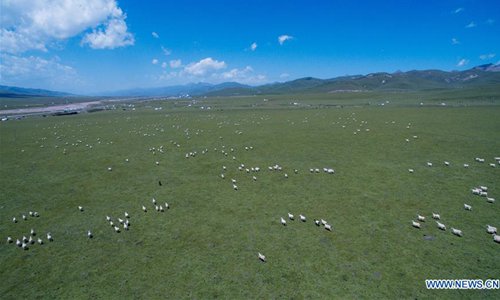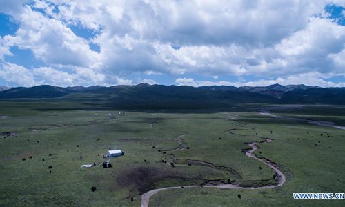 Aerial photo taken on July 29, 2019 shows the picturesque summer scenery of Qilian ranch in Qilian County, northwest China's Qinghai Province. (Xinhua/Wu Gang)