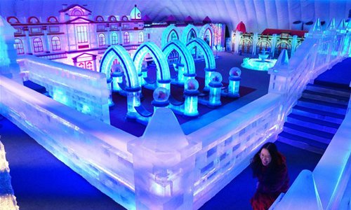 A woman plays in the indoor ice-snow theme park of Harbin Ice-Snow World in Harbin, capital of northeast China's Heilongjiang Province, July 28, 2019. The indoor ice-snow theme park of Harbin Ice-Snow World, with from minus 5 to minus 8 degrees Celsius inside, has attracted a lot of visitors to enjoy the cool place during summer time. (Xinhua/Wang Jianwei)