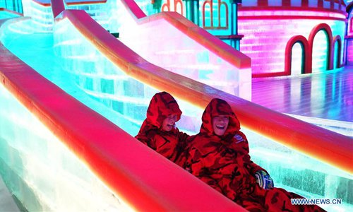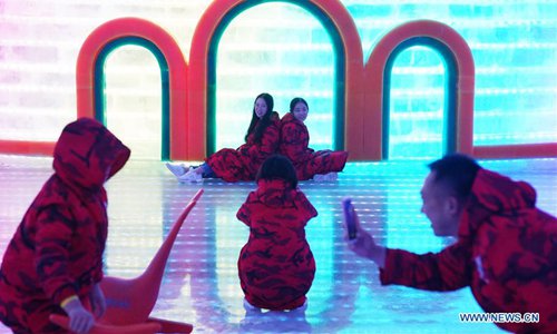 Visitors play on the ice slide in the indoor ice-snow theme park of Harbin Ice-Snow World in Harbin, capital of northeast China's Heilongjiang Province, July 28, 2019. The indoor ice-snow theme park of Harbin Ice-Snow World, with from minus 5 to minus 8 degrees Celsius inside, has attracted a lot of visitors to enjoy the cool place during summer time. (Xinhua/Wang Jianwei)