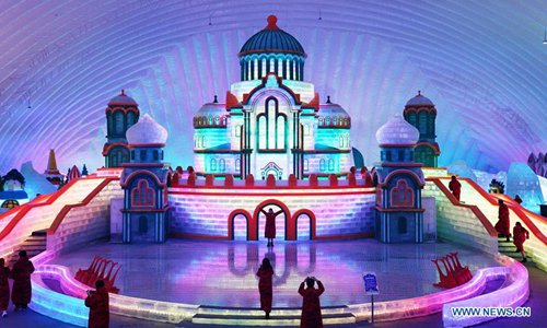 Visitors take photos in the indoor ice-snow theme park of Harbin Ice-Snow World in Harbin, capital of northeast China's Heilongjiang Province, July 28, 2019. The indoor ice-snow theme park of Harbin Ice-Snow World, with from minus 5 to minus 8 degrees Celsius inside, has attracted a lot of visitors to enjoy the cool place during summer time. (Xinhua/Wang Jianwei)