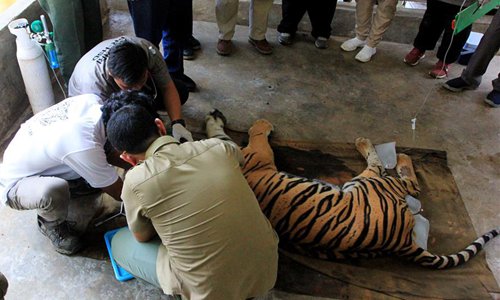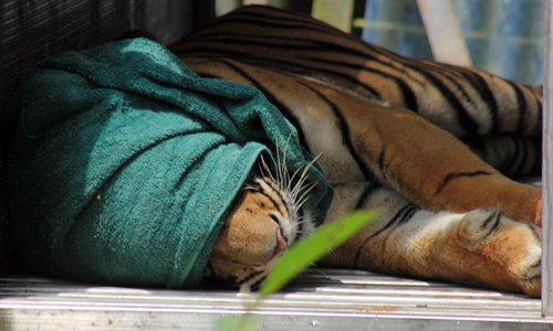 Staff members examine the condition of a Sumatran tiger at Dharmasraya Tiger Rehabilitation Center in West Sumatra, Indonesia, July 29, 2019. The Environmental Ministry with Dharmasraya Tiger Rehabilitation Center and ARSARI Foundation released two Sumatran tigers, one female named Bonita and one male named Atan Bintang, on the occasion of Global Tiger Day (also known as International Tiger Day) that falls on July 29. (Photo by Andri Mardiansyah/Xinhua)