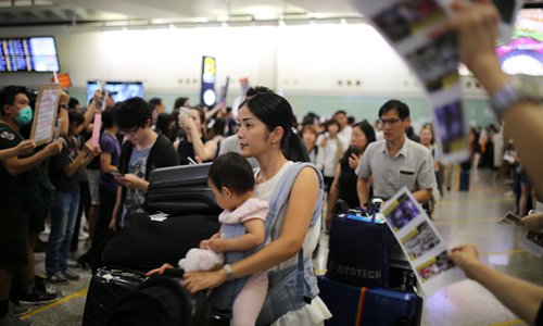 Travelers pass through a crowd of protesters at the Hong Kong International Airport Terminal 1 arrival hall on Friday. The protest of Hong Kong opposition forces had annoyed passengers and disrupted the busy airport. Photo: Fan Lingzhi/GT