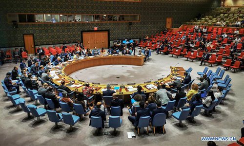 The United Nations Security Council holds a meeting on the situation in Syria, at the UN headquarters in New York, on July 30, 2019. The UN humanitarian chief Mark Lowcock on Tuesday said the intensified bombing in Idlib of Syria has been hitting civilian targets in the past three months, destroying at least 17 villages. (Xinhua/Li Muzi)