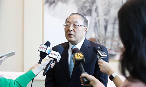 Zhang Jun, the new China's permanent representative to the United Nations, speaks to the press at the UN headquarters in New York, July 30, 2019. On the first day of taking post as China's permanent representative to the United Nations, Zhang Jun pledged on Tuesday that China, one of the five permanent members of the Security Council, will firmly uphold multilateralism and support the United Nations in playing an important role. (Xinhua/Li Muzi)