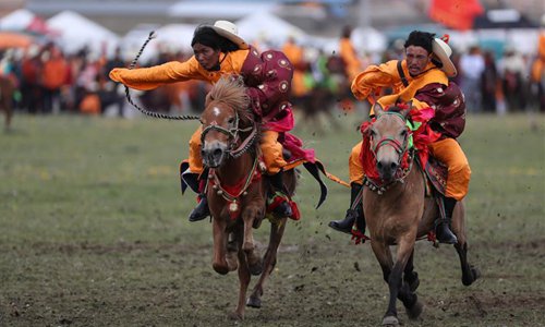 A rider performs horsemanship during a horse racing festival in Litang County, southwest China's Sichuan Province, July 30, 2019. (Xinhua/Jiang Hongjing)