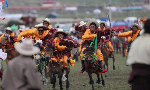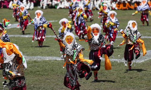 People perform Tibetan opera on the opening ceremony of a horse racing festival in Litang County, southwest China's Sichuan Province, July 30, 2019. (Xinhua/Jiang Hongjing)