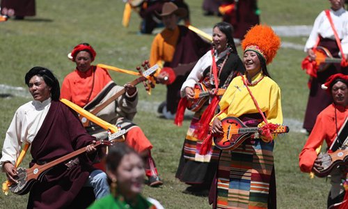People play musical instruments on the opening ceremony of a horse racing festival in Litang County, southwest China's Sichuan Province, July 30, 2019. (Xinhua/Jiang Hongjing)