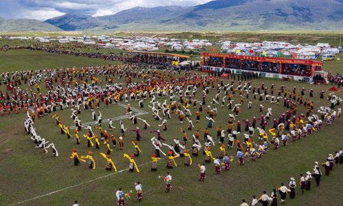 People perform Guozhuang dance, or Tibetan bonfire dance, on the opening ceremony of a horse racing festival in Litang County, southwest China's Sichuan Province, July 30, 2019. (Xinhua/Jiang Hongjing)
