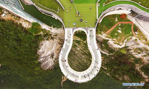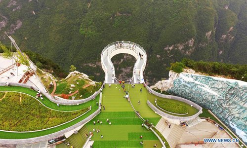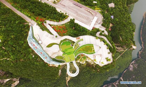 Aerial photo taken on July 30, 2019 shows tourists going sightseeing on a transparent cantilever bridge at the Yunyang Longgang Geological Park in Chongqing, southwest China. (Xinhua/Wang Quanchao)