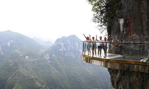 Tourists pose for a group photo on a transparent walkway at the Yunyang Longgang Geological Park in Chongqing, southwest China, July 30, 2019. (Xinhua/Wang Quanchao)