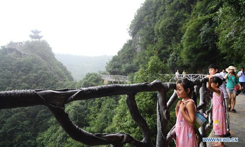 Tourists enjoy the scenery of the Yunyang Longgang Geological Park in Chongqing, southwest China, July 30, 2019. (Xinhua/Wang Quanchao)