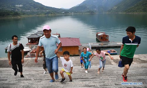 Tourists go ashore at the Yunyang Longgang Geological Park in Chongqing, southwest China, July 30, 2019. (Xinhua/Wang Quanchao)