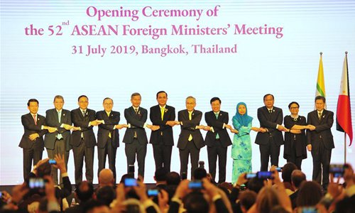 Delegates pose for a group photo during the opening ceremony of the 52nd ASEAN Foreign Ministers' Meeting in Bangkok, capital of Thailand, July 31, 2019. The opening ceremony of the 52nd ASEAN Foreign Ministers' Meeting was held here. (Xinhua/Rachen Sageamsak)