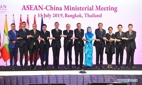 Chinese State Councilor and Foreign Minister Wang Yi (5th L) takes part in the China-ASEAN foreign ministers' meeting in Bangkok, capital of Thailand, July 31, 2019. (Xinhua/Rachen Sageamsak)