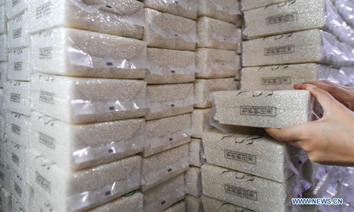 A staff member of Wuyuan Farm arranges rice at a warehouse in Huinan County, northeast China's Jilin Province, July 30, 2019. Huinan is one of the leading rice producing areas in northeast China. In Huinan's Chaoyang Township, local authorities take various measures to boost green and organic agricultural development including raising ducks in rice fields, raising pests' natural enemy, spraying fungicides and disinfesting fields by solar power lamps. The rice production wins market share due to better quality and green development. (Xinhua/Wang Haofei)