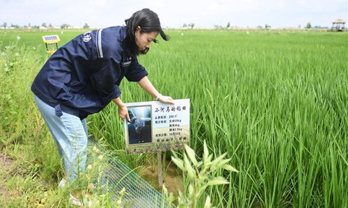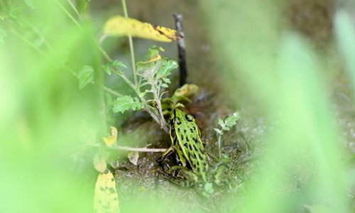 A frog is seen in the rice fields on Wuyuan Farm in Huinan County, northeast China's Jilin Province, July 30, 2019. Huinan is one of the leading rice producing areas in northeast China. In Huinan's Chaoyang Township, local authorities take various measures to boost green and organic agricultural development including raising ducks in rice fields, raising pests' natural enemy, spraying fungicides and disinfesting fields by solar power lamps. The rice production wins market share due to better quality and green development. (Xinhua/Wang Haofei)