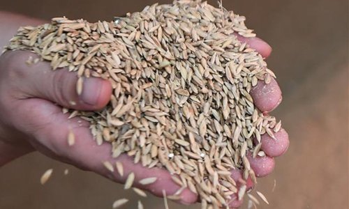A staff member of Wuyuan Farm shows harvested rice in Huinan County, northeast China's Jilin Province, July 30, 2019. Huinan is one of the leading rice producing areas in northeast China. In Huinan's Chaoyang Township, local authorities take various measures to boost green and organic agricultural development including raising ducks in rice fields, raising pests' natural enemy, spraying fungicides and disinfesting fields by solar power lamps. The rice production wins market share due to better quality and green development. (Xinhua/Wang Haofei)
