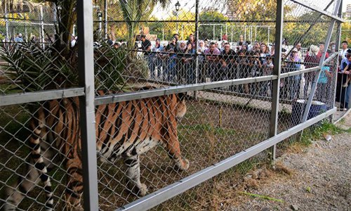 People look at a tiger at the "Sham Gathers Us" (Sham means Damascus) festival in Damascus, capital of Syria, July 30, 2019. There are a few tigers and lions left at the Damascus Zoo. These animals were brought to the festival for people to watch. (Photo by Ammar Safarjalani/Xinhua)