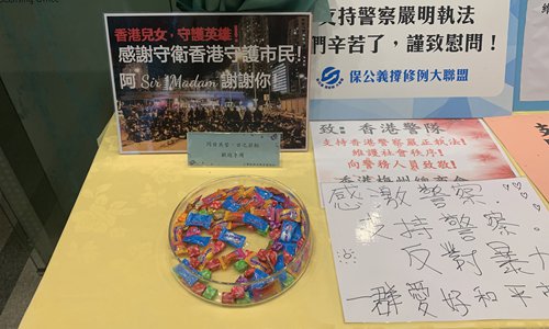 Messages sent to the Hong Kong police that express appreciation for their professionalism in handling violent protests are displayed inside the headquarters of the Hong Kong Police Force in Wan Chai on Thursday. Photo: Chen Qingqing/GT