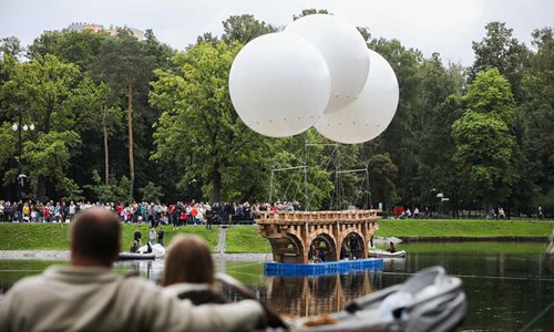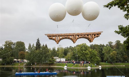 A flying bridge made of cardboard and duct tape is seen in Ostankino park in Moscow, Russia, on Aug. 1, 2019. A 18-meter-long flying bridge made of cardboard and duct tape was assembled and installed in Ostankino park of Moscow on Thursday. The bridge was lifted into the air with the help of three balloons filled with helium. (Photo by Maxim Chernavsky/Xinhua)