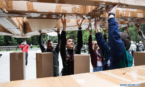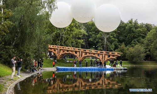 Volunteers assemble a bridge made of cardboard and duct tape in Ostankino park in Moscow, Russia, on Aug. 1, 2019. A 18-meter-long flying bridge made of cardboard and duct tape was assembled and installed in Ostankino park of Moscow on Thursday. The bridge was lifted into the air with the help of three balloons filled with helium. (Photo by Maxim Chernavsky/Xinhua)