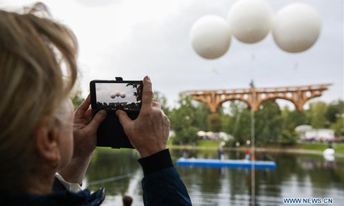 People look at a flying bridge made of cardboard and duct tape in Ostankino park in Moscow, Russia, on Aug. 1, 2019. A 18-meter-long flying bridge made of cardboard and duct tape was assembled and installed in Ostankino park of Moscow on Thursday. The bridge was lifted into the air with the help of three balloons filled with helium. (Photo by Maxim Chernavsky/Xinhua)