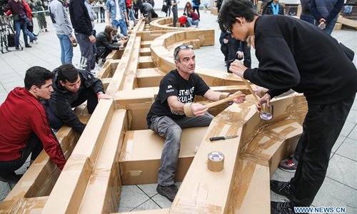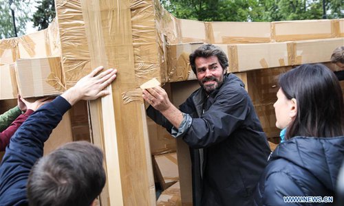 Artist Olivier Grossetete (C) works on a bridge made of cardboard and duct tape in Ostankino park in Moscow, Russia, on Aug. 1, 2019. A 18-meter-long flying bridge made of cardboard and duct tape was assembled and installed in Ostankino park of Moscow on Thursday. The bridge was lifted into the air with the help of three balloons filled with helium. (Photo by Maxim Chernavsky/Xinhua)